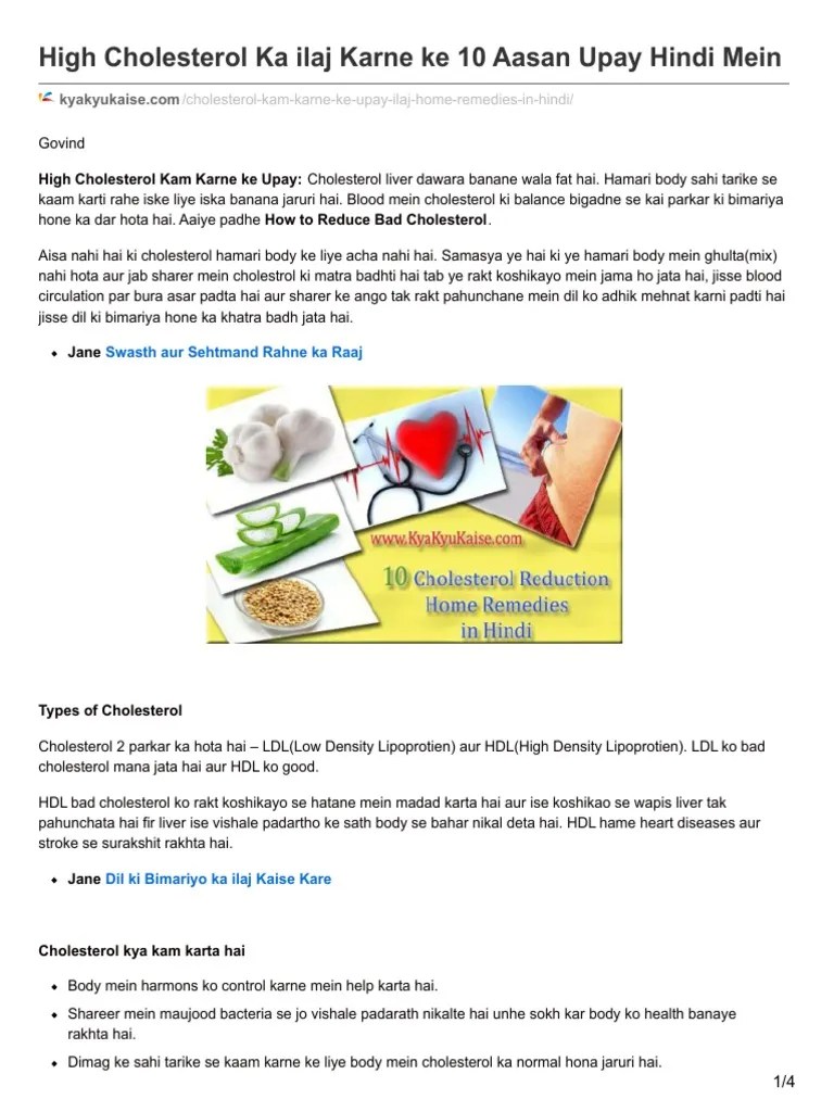 Mujhe 9 varshon se diabetes thyroid haipichle 2 varshon se mere tute pair ka illaj chal raha haiaur aaj mai Dant me gadhha aur cavity ka dard se bahut pareshan thi liking aap ka article padhdne ke baad mujhe ek asha ki Kiran miliarticles share karne ke liye mujhe aur bhi asahniya dard se bachane ke liye aapka aur baba Raamdev Ji ka koti. Cholesterol badhne se arteries me blockage hota hai aur heart par asar hota hai. Who क अनसर हद रग अब पर वशव म मत क मखय करण सज ह.